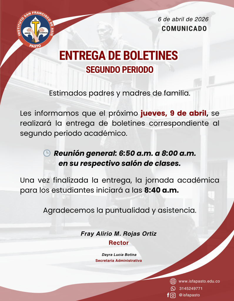 Estimados padres y madres de familia, a continuación les informamos que el día jueves 9 de abril se llevará a cabo la entrega de boletines correspondiente al segundo periodo académico. Agradecemos tener en cuenta la siguiente información.